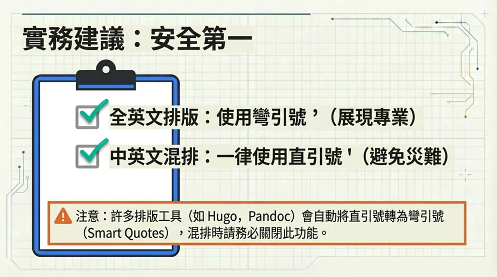 '(U+0027) 與彎引號’(U+2019)。 - 排版工具若有「智慧型引號(smart quotes)」自動替換功能(例如 Pandoc、Hugo),應務必檢查並關閉,以免輸入時被自動偷換。
