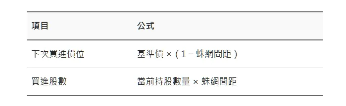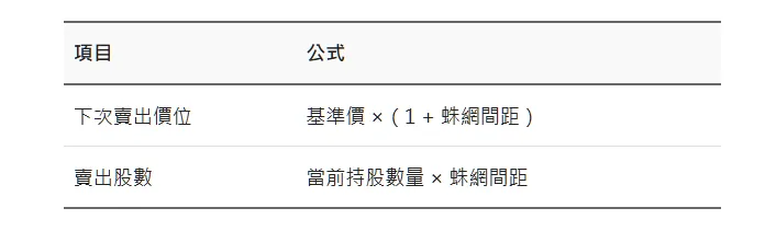 這套規則有一個重要特性:交易數量是按比例(proportional)計算的——每次買賣的股數取決於當前持有的股數,而非固定張數。這種「比例型蛛網」的設計,能自動實現以下效果: