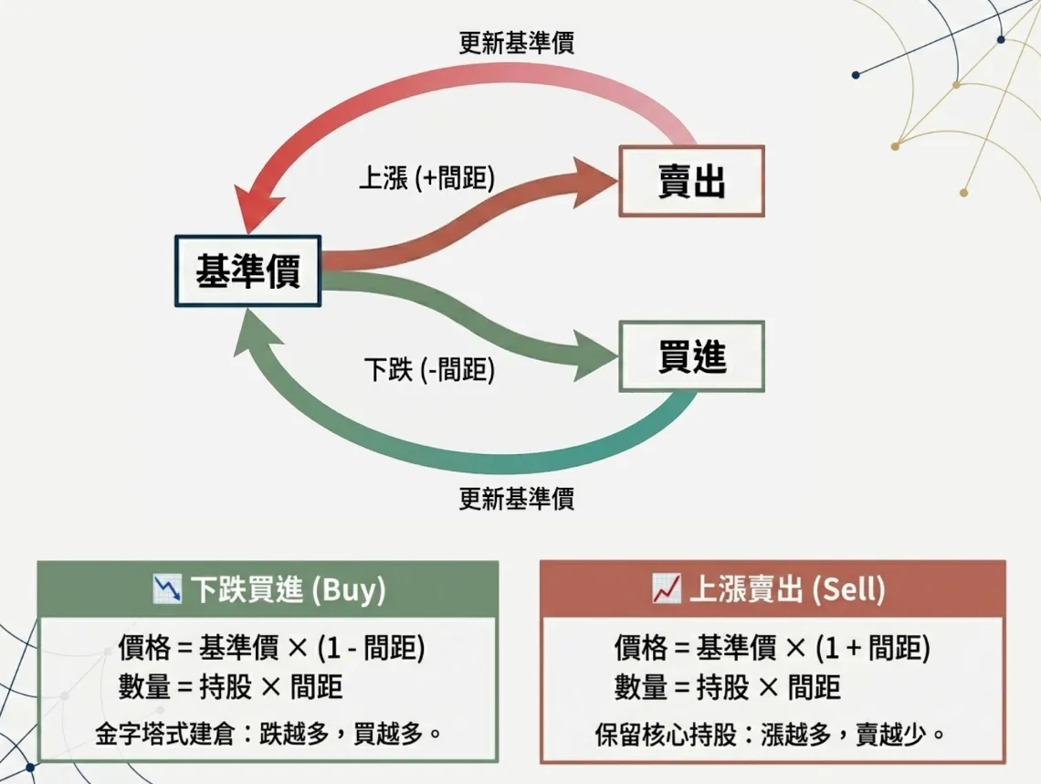 - 圖示是簡化的:為了方便理解,這張圖使用固定的 10 元作為間距。但在實際操作中,會使用「百分比」(例如 5% 或 10%)來設定間距。這樣的好處是,網格會自動適應高價股或低價股的波動特性,不需要你手動去算那一格是多少錢。