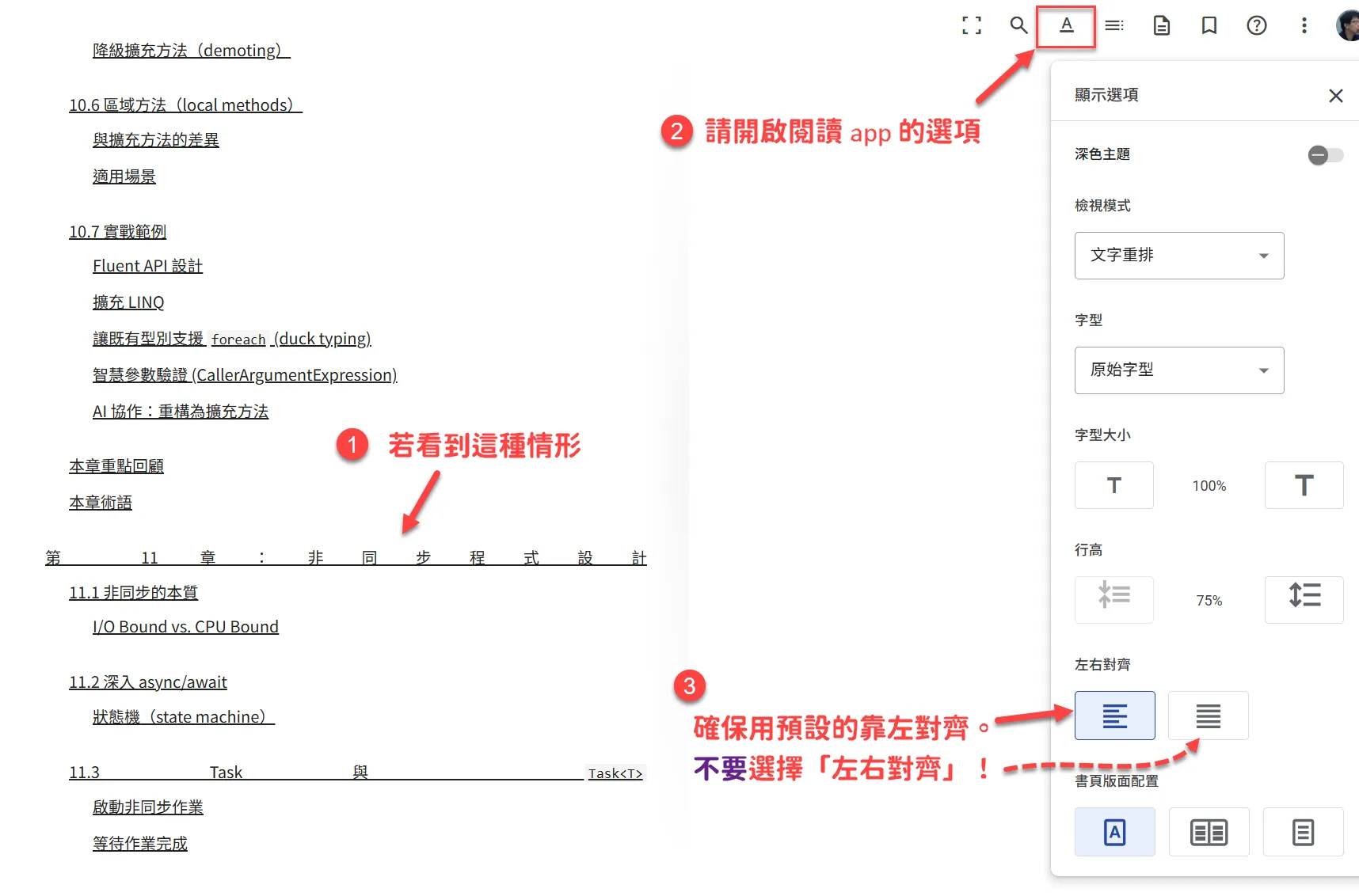 (小提示:在閱讀畫面中點擊「Aa」圖示進入顯示設定,並確保對齊方式設定為「靠左對齊」即可。)