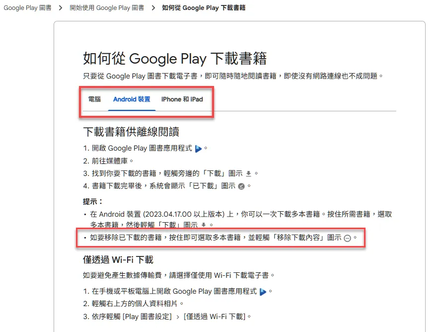 如果是 Google Play 圖書平台,可參考官方文件:解決書籍載入問題。該文件有三個頁籤:電腦、Android 裝置、iPhone 和 iPad,請依你的閱讀設備類型來查看對應的說明。底下是 Android 裝置說明內容截圖: