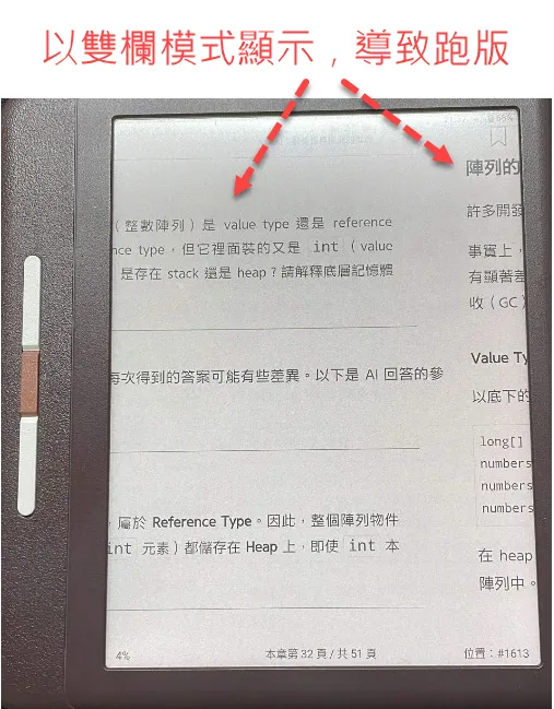 這裡說的「跑版很嚴重」,是指無論你將閱讀器設定為直排或橫排、單頁或雙欄顯示,畫面都會強制以雙欄排版呈現,不僅放不下整個顯示區域,還會導致版面嚴重錯位。情況就如同下圖所示: